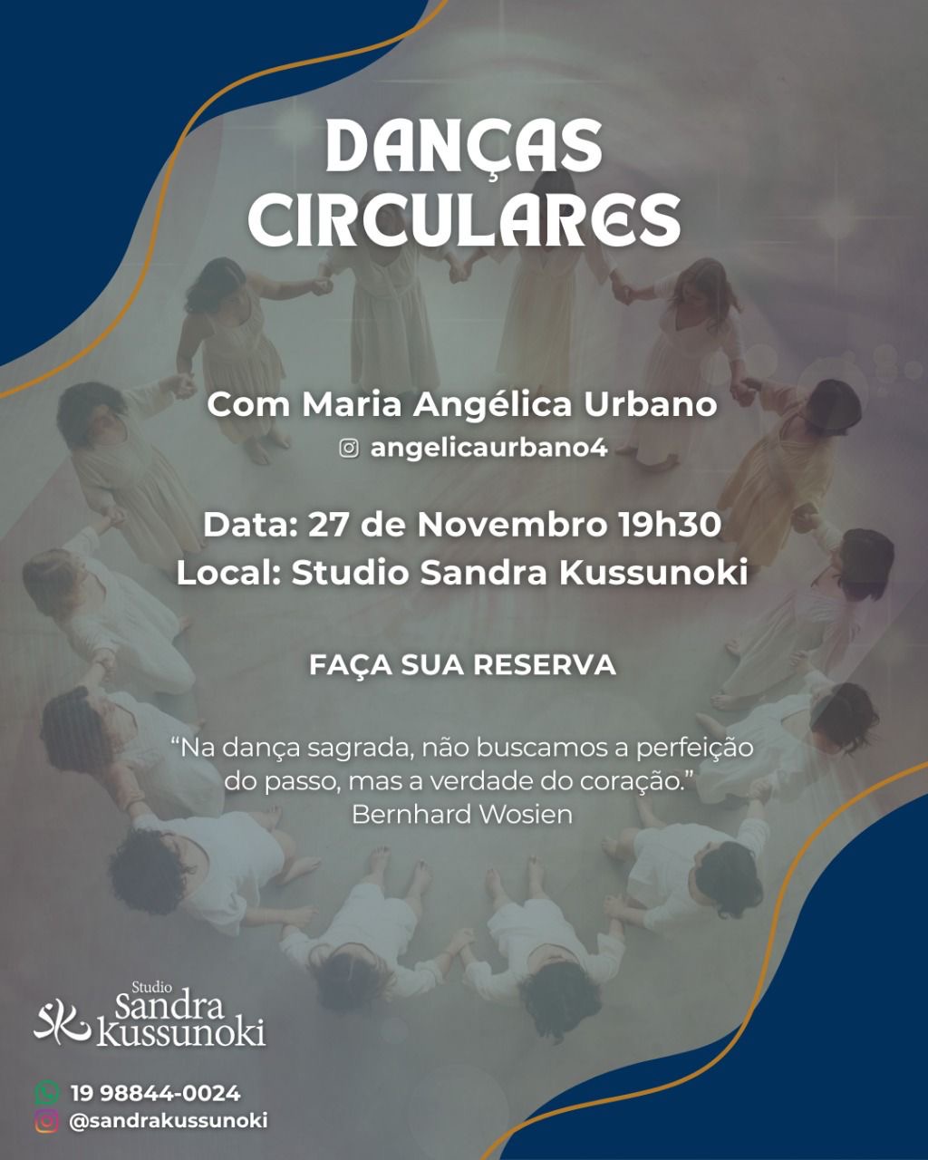 Vivência de Dança Circular Tema: Dançando a finalização deste ano e abertura para o próximo. Cuidado, amor, saúde e paz. ✨ Um convite para se reconectar com sua essência, harmonizar corpo, mente e espírito através da sabedoria ancestral das Danças Circulares. 📅 Data: 27 de Novembro 🕢 Horário: 19h30 📍 Local: Studio Sandra Kussunoki – Mogi Mirim/SP