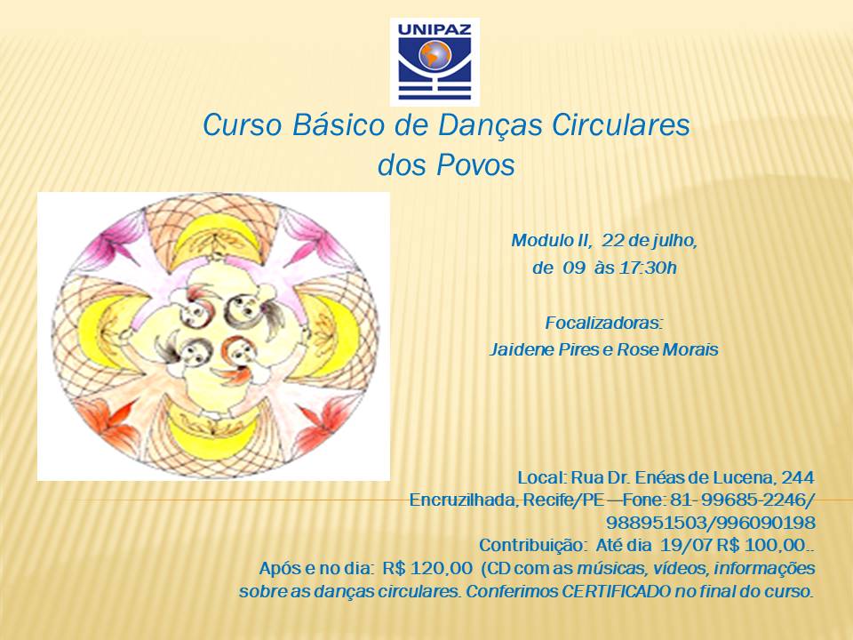 Faremos um curso teórico-prático em sete encontros, um domingo por mês, de junho a dezembro de 2018, totalizando 56 horas de trabalho. Introduzir o público no universo das danças circulares é o propósito deste curso. Em cada encontro, um repertório diferente com danças tradicionais gregas, israelitas, ciganas, celtas, russas, africanas, búlgaras, brasileiras, coreografias contemporâneas e danças meditativas será trabalhado.