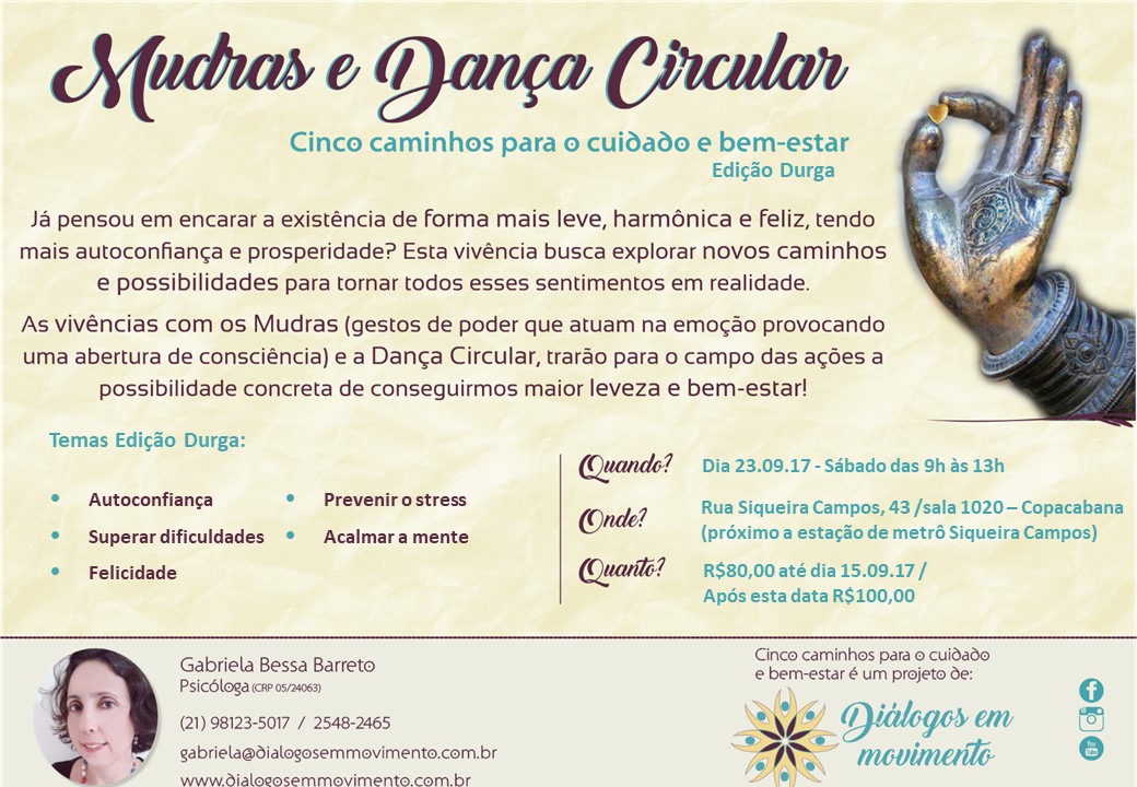 Vivência de Danças Circulares que privilegiam o gestual aliado à prática de MUDRAS. Estes têm como objetivo gerar harmonia e equilíbrio.