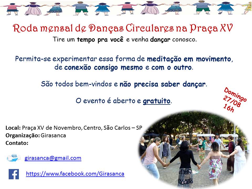 Tire um tempo pra você e venha dançar conosco. Permita-se experimentar essa forma de meditação em movimento, de conexão consigo mesmo e com o outro. NÃO PRECISA SABER DANÇAR! O evento é aberto e gratuito. Curta nossa página: https://www.facebook.com/Girasanca