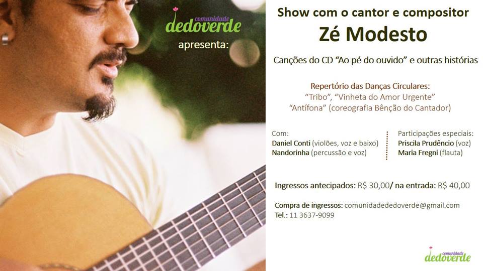 Zé Modesto é compositor de lindas canções, seu repertório também entrou para o universo das Danças Circulares, graças às canções Tribo, Antífona (coreografia Bênção do Cantador de Claudio Delfini) e Vinheta do Amor Urgente. Teremos danças circulares no final do show ao som de Zé Modesto e banda.