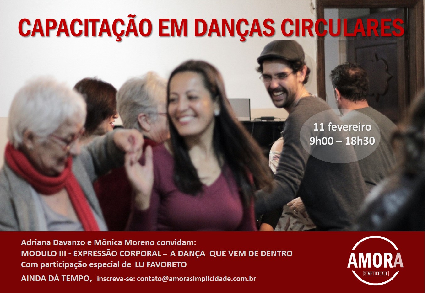 Capacitação de Danças Circulares da Amora Simplicidade! No próximo módulo o convite é fazermos uma investigação linda acerca da expressão corporal e teremos uma convidada muito especial conduzindo este olhar pra dança que vem de dentro: LU FAVORETO! Temos poucas vagas! Inscreva-se!