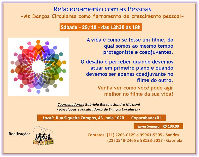 Convidamos você para vivenciar conosco em uma tarde dinâmica, profunda e descontraída, as diversas qualidades do relacionamento interpessoal através de mandalas, reflexões de autoconhecimento e danças circulares!!!! Porque é impossível viver sem se relacionar com os outros!!!!