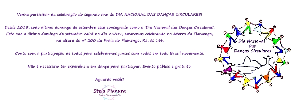 Venham participar da celebração do segundo ano do Dia Nacional das Danças Circulares! Desde 2015, todo último domingo de setembro está consagrado como o Dia Nacional das Danças Circulares! Este ano o último domingo de setembro cairá no dia 25/09, estaremos celebrando no Aterro do Flamengo, na altura do nº 200 da Praia do Flamengo, RJ, às 16h. Conto com a participação de todos para celebrarmos juntos com rodas em todo Brasil novamente. Não é necessário ter experiência em dança para participar.