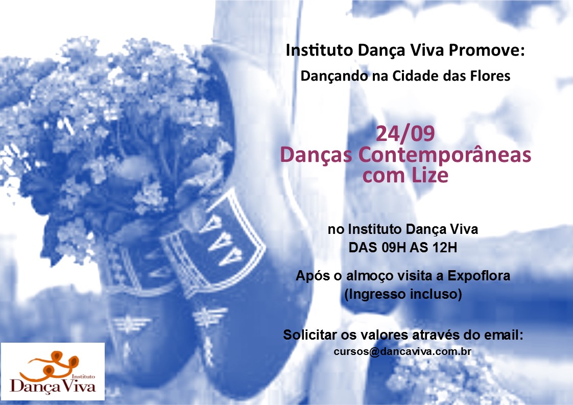 Dançar no Instituto Dança Viva, danças contemporâneas. Friedel Kloke, Nanni Kloke, Pablo Scornik, Rosely Correia e uma coreografia da Lize. Trazendo alegria, consciência corporal. Depois quem quiser pode visitar a Expoflora.