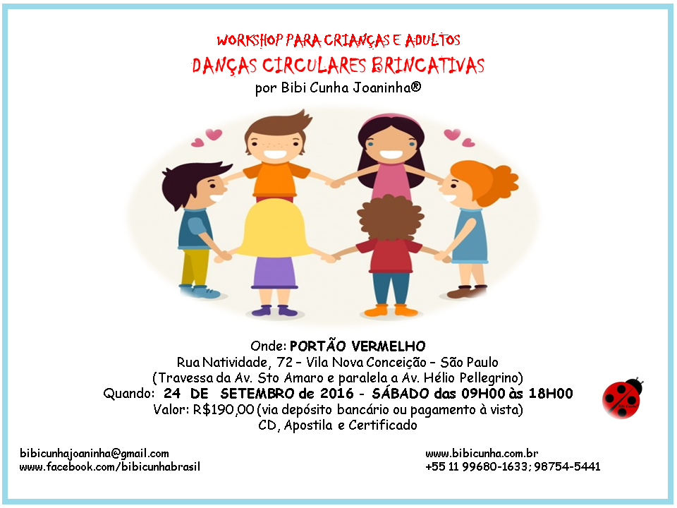 Workshop de Danças Circulares Brincativas por Bibi Cunha Joaninha com danças, jogos e brincadeiras que compartilhamos no universo infanto-juvenil como forma de contarmos nossas histórias fortalecendo nossos elos interiores com o Ser Criança e o Ser Adulto - o passado e o futuro em nós: o presente!