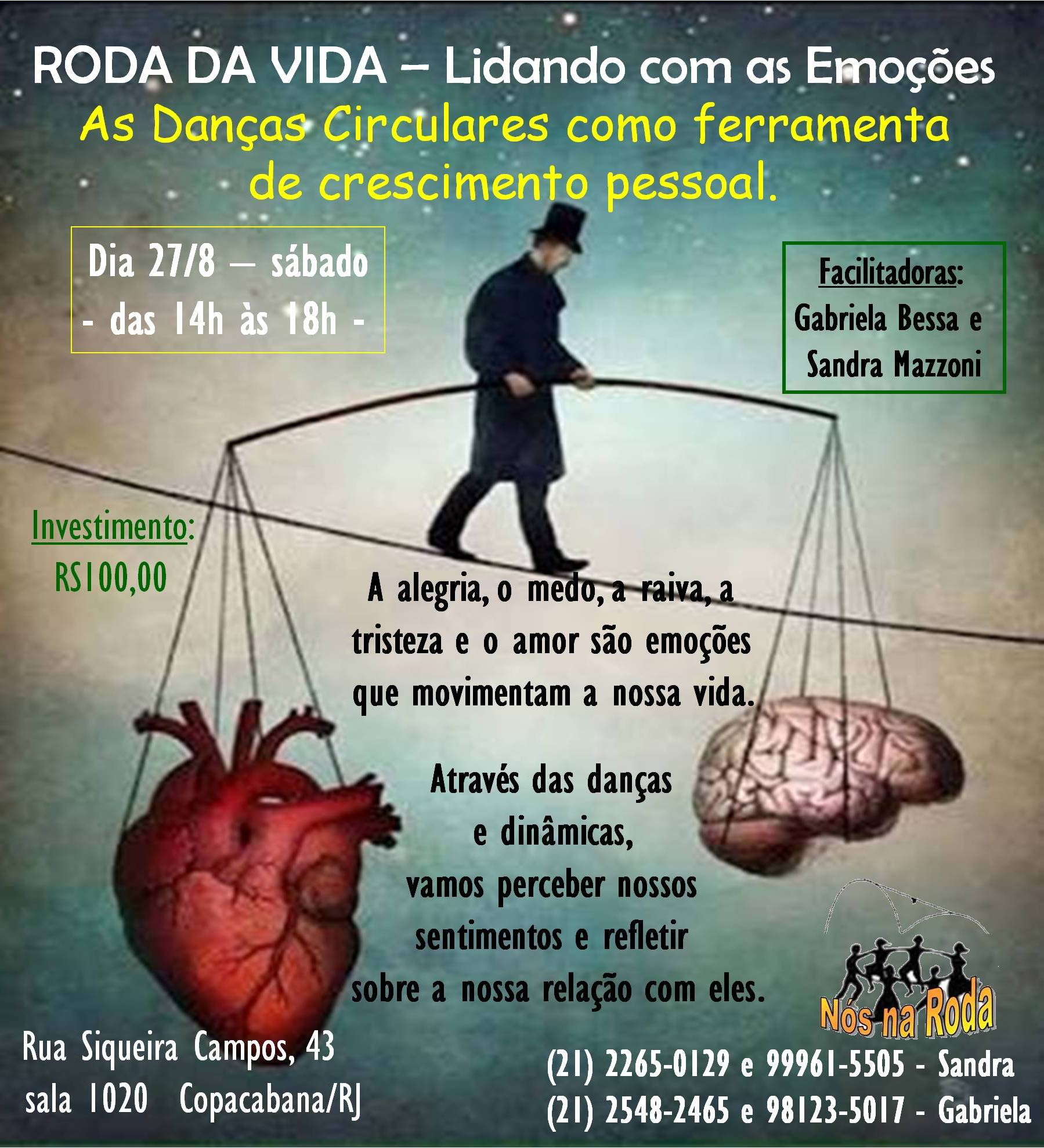 Dança Circular como ferramenta de crescimento pessoal. A alegria, o medo, a raiva, a tristeza e o amor são emoções que movimentam a nossa vida. Através das danças circulares e outras atividades dinâmicas, vamos perceber nossos sentimentos e refletir sobre a nossa relação com eles.