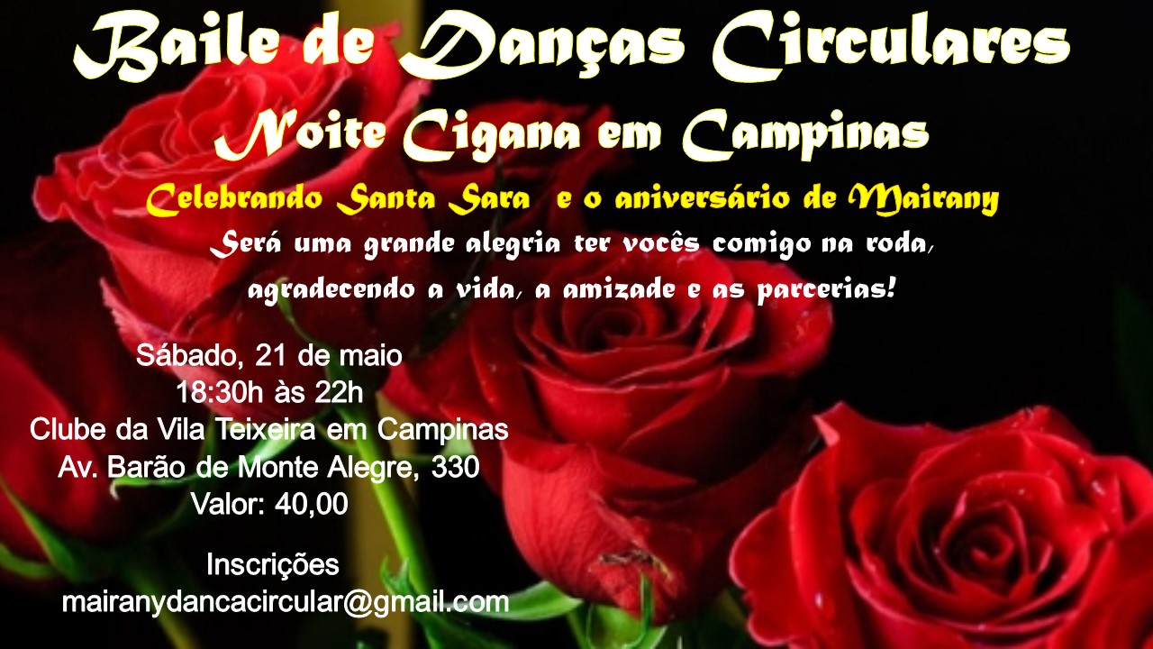 Celebrando mais um ano de vida da Mairany e o dia de Santa Sara, Mairany e Angelo conduzirão mais uma Noite Cigana. Fique à vontade para usar suas flores, saias e chales. Necessário confirmar presença pelo email: mairanydancacircular@gmail.com