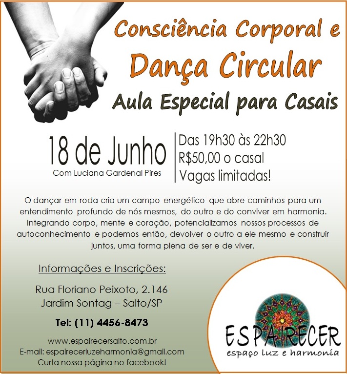 Esta é uma vivência para casais. Um trabalho integrado de Consciência Corporal e Danças Circulares, que busca proporcionar um encontro especial consigo e com o outro, potencializando processos de autoconhecimento e entreajuda, na construção de uma forma plena de ser e viver. Vagas limitadas.