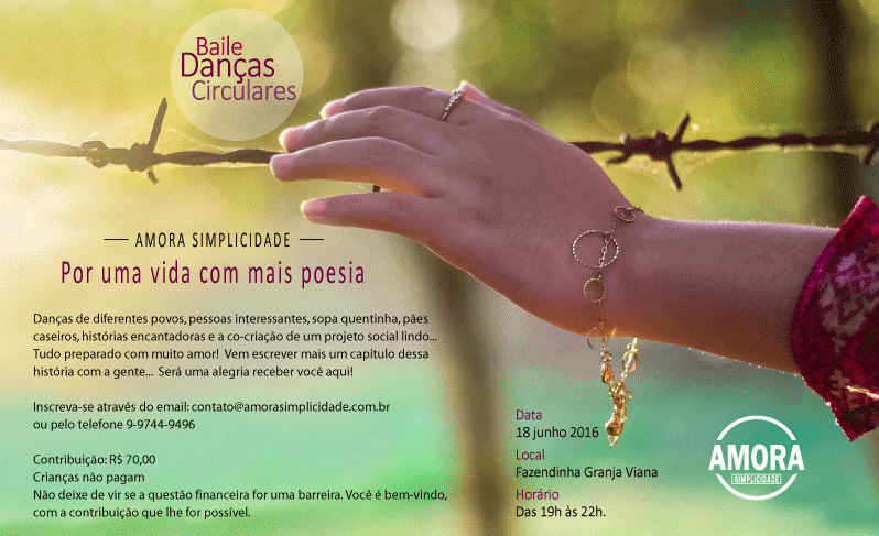 Amora chegou... Nasce da mais poderosa de todas as forças, o amor. Traz no coração sonhos, esperança, fé e um amor capaz de iluminar o mundo. Dentre diversas vivências de desenvolvimento humano, mensalmente, no ultimo sábado de cada mês, teremos os Bailes Circulares, com muita alegria! Venham!